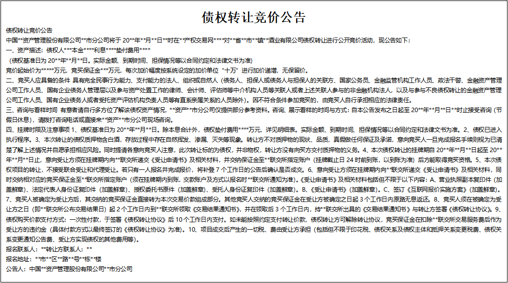 四、挂牌时限及注意事项1、债权基准日为20**年**月**日。除本息合计外,债权垫付费用****万元,详见明细表。实际金额、到期时间、担保情况等以合同约定和法律文书为准。2、债权已进入执行程序。3、本次转让的债权质押物含白酒,存放过程中存在自然挥发、渗漏、灭失等现象。转让方不对质押物的现状、品质,真假做任何保证及承诺,意向竞买人一旦完成报名手续则视为已清楚了解上述情况并自愿承担相应风险。同时提请各意向竞买人注意,此次转让标的为债权,并非物权,转让方没有向买方交付质押物的义务。4、本次债权转让的挂牌期自20**年**月**日起至20**年**月**日止,意向受让方须在挂牌期内向**联交所递交《受让申请书》及相关材料,并交纳保证金至**联交所指定账户(挂牌截止日24时前到账,以到账为准)后方能取得竞买资格。5、本次债权项目的转让,不接受联合受让和代理受让。若只有一人报名并完成报价,将补登7个工作日的公告后确认是否成交。6、意向受让方须在挂牌期内向**联交所递交《受让申请书》及相关材料,同时交纳相对应的竞买保证金至**联交所指定账户(须在挂牌期内到账,交款账户及方式以报名时**联交所通知为准)。《受让申请书》及相关材料包括但不限于以下内容:a、营业执照副本复印件(加盖鲜章)、法定代表人身份证复印件(加盖鲜章)、授权委托书原件(加盖鲜章)、受托人身份证复印件(加盖鲜章)。b、《受让申请书》(加盖鲜章)。c、签订《互联网报价实施方案》(加盖鲜章)。7、竞买人被确定为受让方后,其交纳的竞买保证金直接转为本次交易价款组成部分。其他竞买人交纳的竞买保证金在受让方被确定之日起3个工作日内原路无息返还。8、竞买人须在被确定为受让方之日(即**联交所公布交易结果日)起2个工作日内到**联交所领取《交易结果通知书》,并在领取后3个工作日内,持**联交所出具的《交易结果通知书》与转让方签署《债权转让协议》。9、债权购买价款ks8凯发官方网站的支付方式:一次性付款,于签署《债权转让协议》后10个工作日内支付。如未能按照约定支付转让价款,债权转让方可解除转让协议,竞买保证金在扣除**联交所交易服务费后作为受让方的违约金(具体付款方式以最终签订的《债权转让协议》为准)。10、项目成交后产生的一切税、费由受让方承担(包括但不限于印花税、债权关系及债权主体和抵押关系变更税费、债权关系变更凯发k8旗舰厅的公告费、受让方实现债权的其他费用等)。